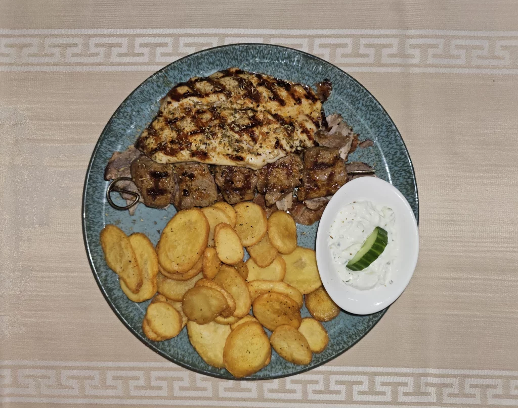 Gyros, 1 Hacksteak, 1 Souvlaki, mit Kartoffelscheiben, Tzatziki und Salat