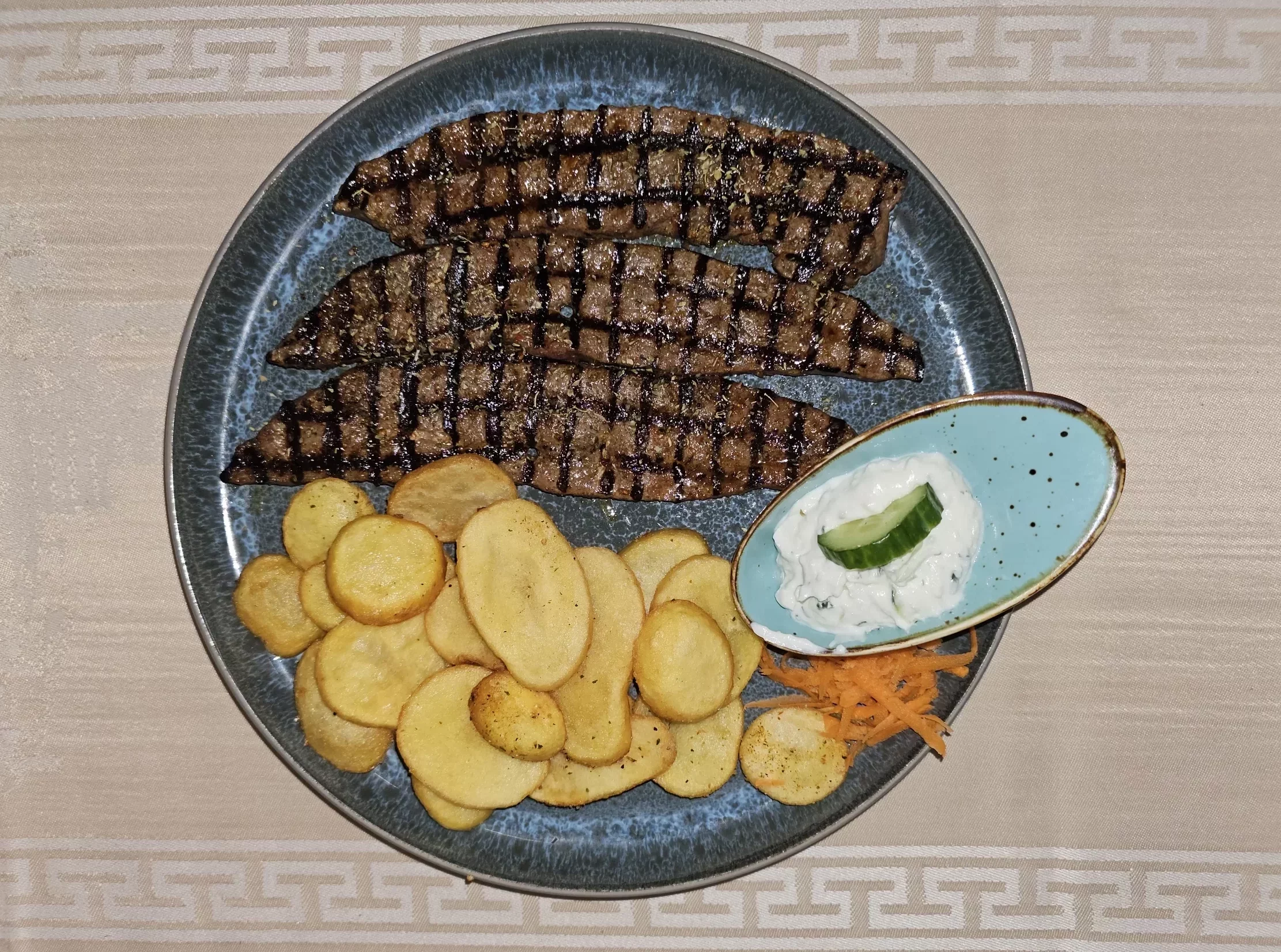 gegrillt, mit Kartoffelscheiben, Tzatziki und Salat