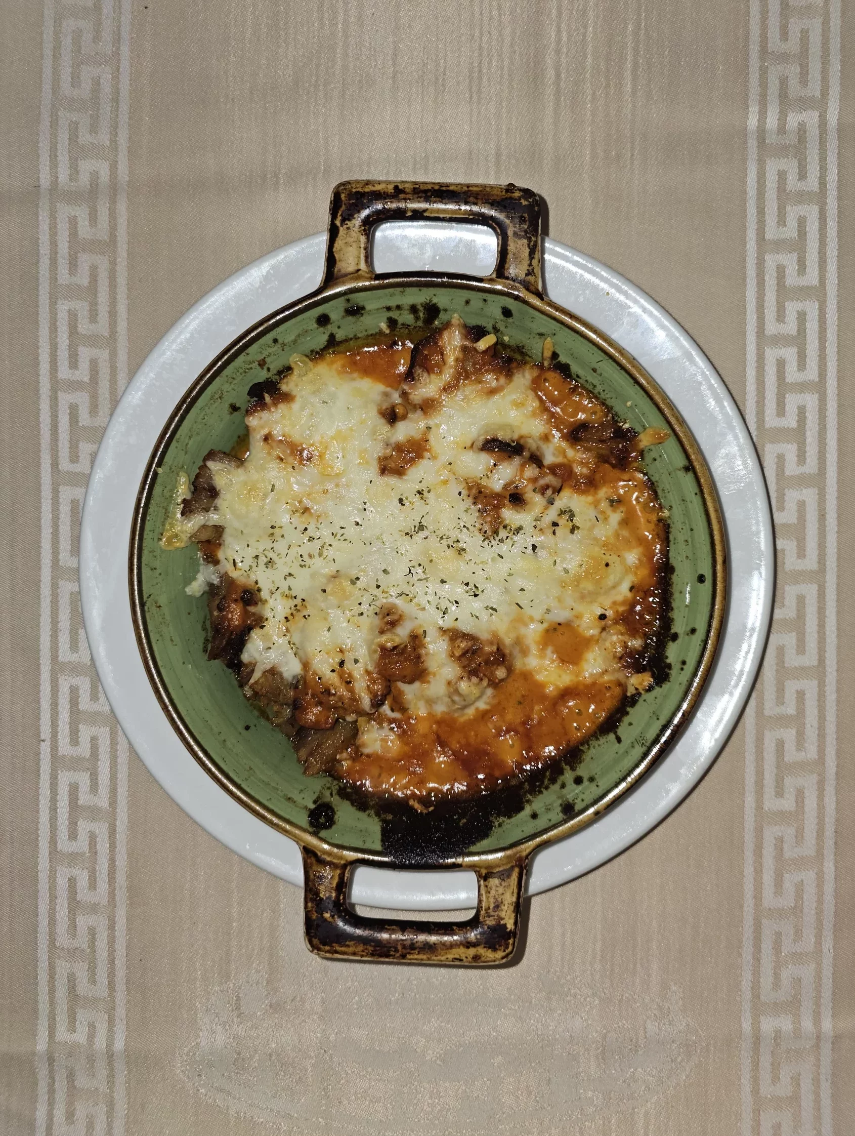 mit Käse, in Metaxasauce dazu Kartoffelscheiben und Salat