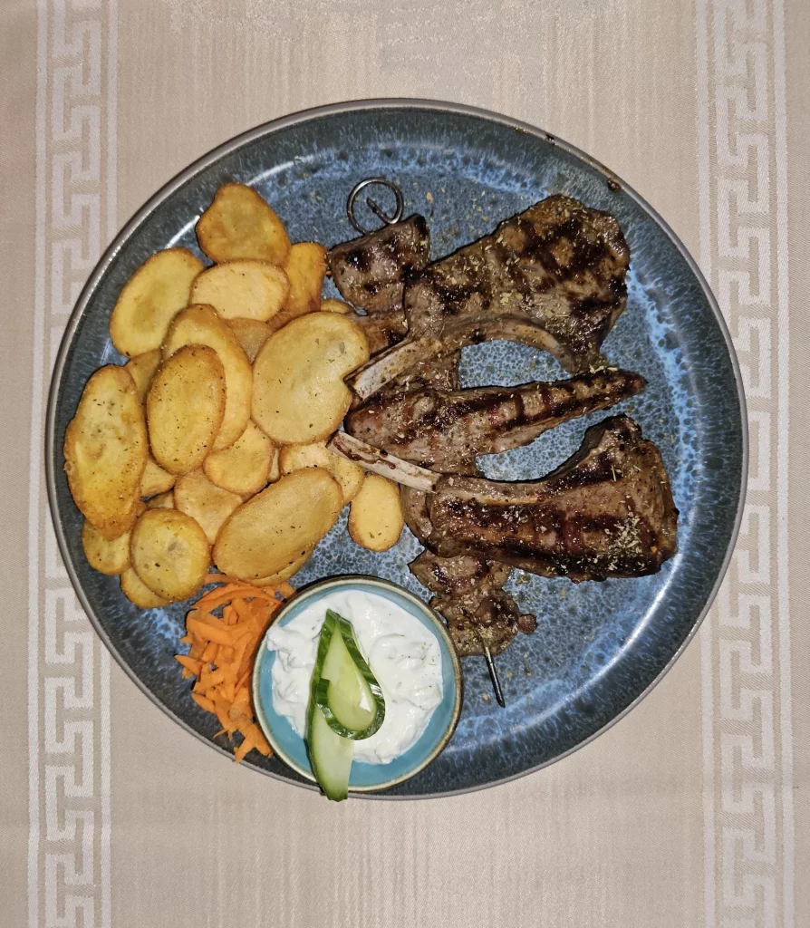 2 Lammkoteletts, 1 Lammfilet, 1 Lammspieß, mit Kartoffelscheiben, Tzatziki und Salat